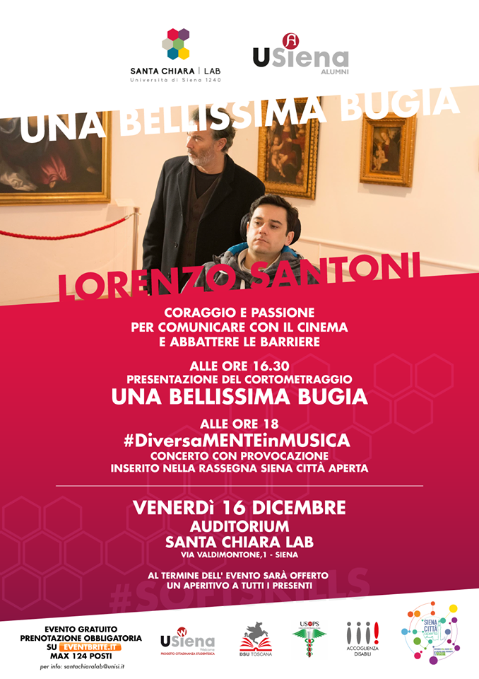 Venerdì 9 dicembre, l’Auditorium del Santa Chiara Lab (Via Valdimontone, 1) ha ospitato la proiezione di un cortometraggio di cui molto si sta parlando in Toscana e non solo. “Una bellissima bugia”, scritto e diretto da Lorenzo Santoni e prodotto da Francesco Falaschi per la Scuola di Cinema di Grosseto, ha infatti partecipato con successo a numerose rassegne e festival, tra cui il Cannes Short Film Festival ed il Festival International du Film sur le Handicap di Cannes.