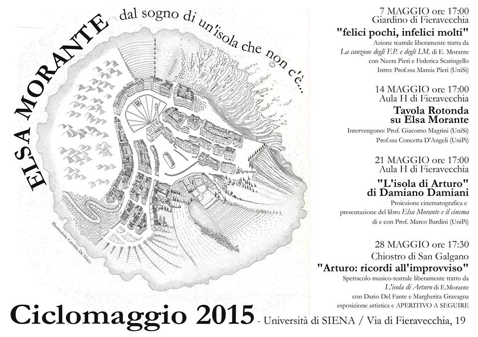 Il terzo incontro (21 Maggio, ore 17), nuovamente in aula H, proporrà uno sguardo cinematografico sull’opera morantiana. Alla presentazione del libro “Elsa Morante e il cinema” del Prof. Marco Bardini (Università di Pisa), seguirà la proiezione del lungometraggio “L’isola di Arturo” per la regia di Damiano Damiani.