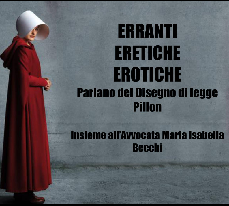 Non Una di Meno invita tutti voi a partecipare all’evento che si terrà oggi (9 Novembre) alle ore 17:30 presso la Corte dei Miracoli di Siena dal titolo “Erranti Eretiche Erotiche“, per discutere dei provvedimenti del disegno di legge Pillon con l’aiuto dell’Avvocata Maria Isabelli Becchi.