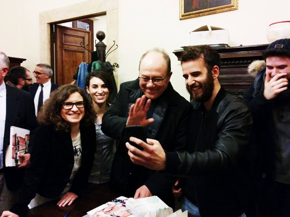 Al termine della conferenza è stata assegnata la medaglia onoraria a Carlo e Luca Verdone insieme al vecchio goliardo (il cappello tipico delle Feriae Matricularum, dalla particolare punta sporgente in avanti, ndr).