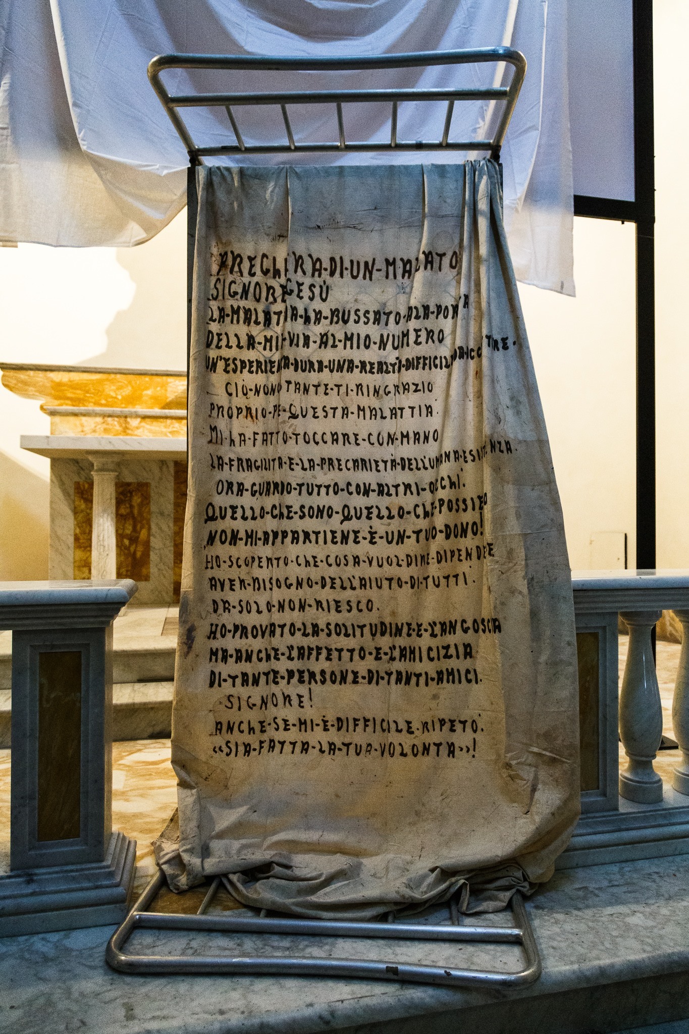 Sui gradini che danno accesso all’abside, è stato posto un letto di ospedale (proveniente da un manicomio di Novara) sistemato in verticale “come a rievocare un crocifisso”, dice lo stesso Sesia, “la sacralità e il rispetto della malattia ”. Dal letto pende un lenzuolo che riporta un’iscrizione, intitolata dall’anonimo autore “Preghiera di un malato”. Il muro di una delle stanze infatti, ha restituito questo testo inciso probabilmente con la fibia di una cintura.