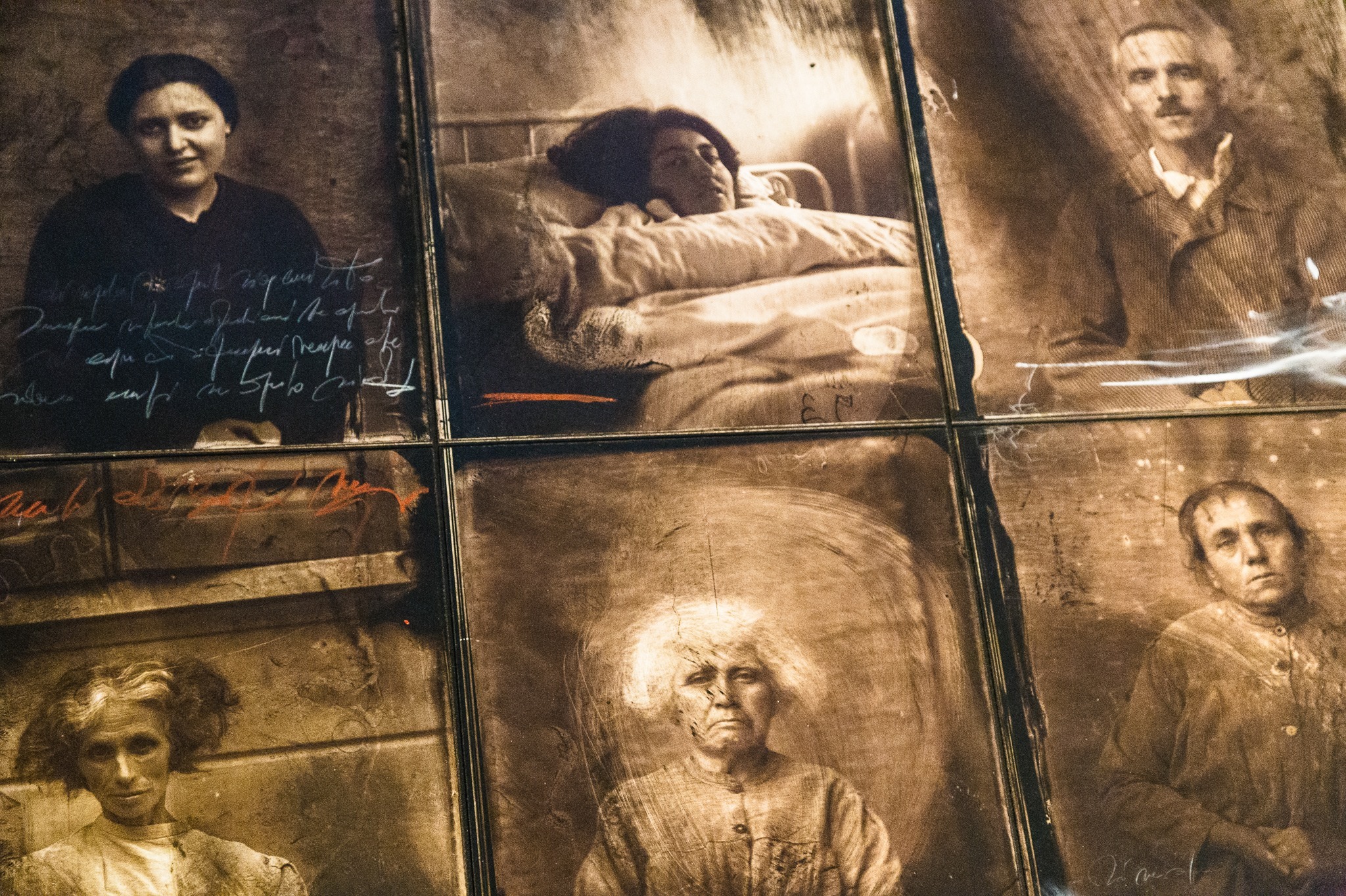 L’atmosfera della mostra rivela toni sacrali: voci registrate escono dai confessionali, e i volti dei degenti, in un’aura dorata come nelle icone medievali, stanno lì a guardare, disposti ordinatamente sui muri a ricordarci della loro esistenza.