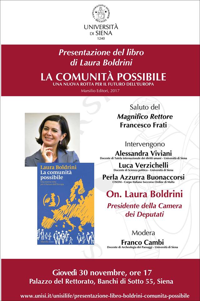 Giovedì 30 novembre la Presidente della Camera Laura Boldrini era presente a Siena per la presentazione del suo ultimo libro “La comunità possibile. La nuova rotta per il futuro dell’Europa”. L’evento, tenutosi presso il Rettorato ed inserito nel progetto di integrazione e di giustizia sociale, ha richiamato un pubblico piuttosto eterogeneo ma prevalentemente costituito da ragazzi, a conferma dell’attualità e dell’importanza di questo tema. Tanti sono gli interrogativi e le difficoltà alle quali l’Unione Europea deve far fronte, per questo quello della Boldrini è un invito a riflettere sul ruolo della nostra società e delle generazioni future.