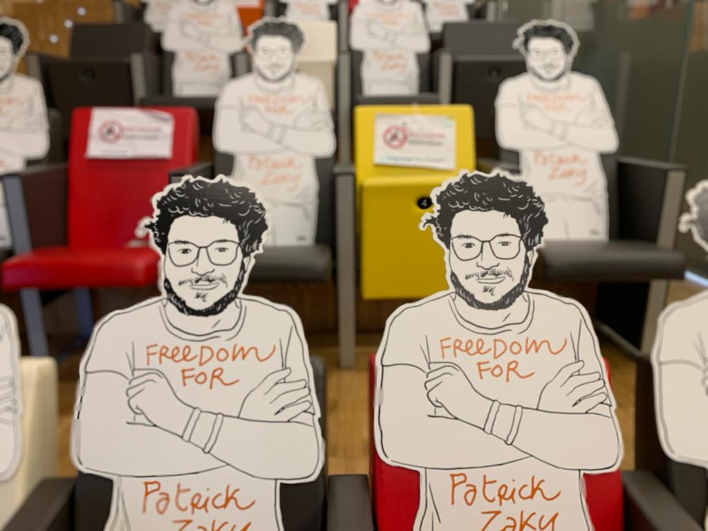 “…E quindi per una settimana c’è stato questo disegno gigante a Bologna e da lì è nata l’idea del Rettore dell’Università, di realizzare le sagome, visto che le sale universitarie, a causa dell’emergenza Covid, erano vuote decidemmo di metterle come fossero dei veri studenti nell’Aula Magna. Giorni dopo le sagome furono spostate nelle aule studio, ad occupare i posti che dovevano essere lasciati vuoti per il distanziamento. Ciò doveva simboleggiare il fatto che Patrick è uno studente come tutti gli altri e che la sorte di Patrick sarebbe potuta accadere a chiunque in un paese senza democrazia…”